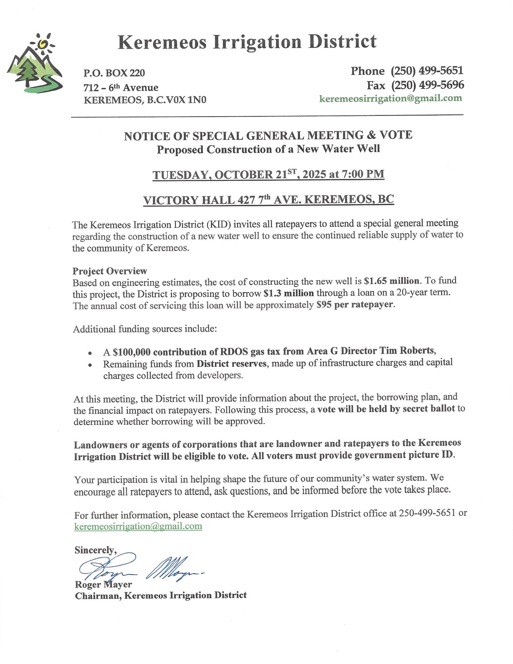 The Keremeos Irrigation District encourages you to read the attached notice and attend the Special Public Meeting on Tuesday, October 21st, 2025 at 7:00 PM at the Victory Hall. The KID needs your approval for the borrowing of funds to construct a new well to replace the water capacity lost from our 1st Ave. well (not in use) to meet existing demand. The new well will allow us to meet peak demand during the summer months and allow new connections on the system to proceed.